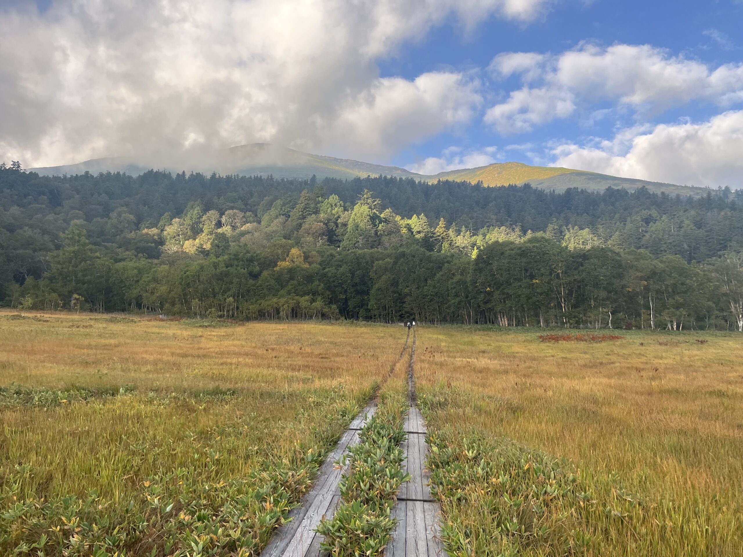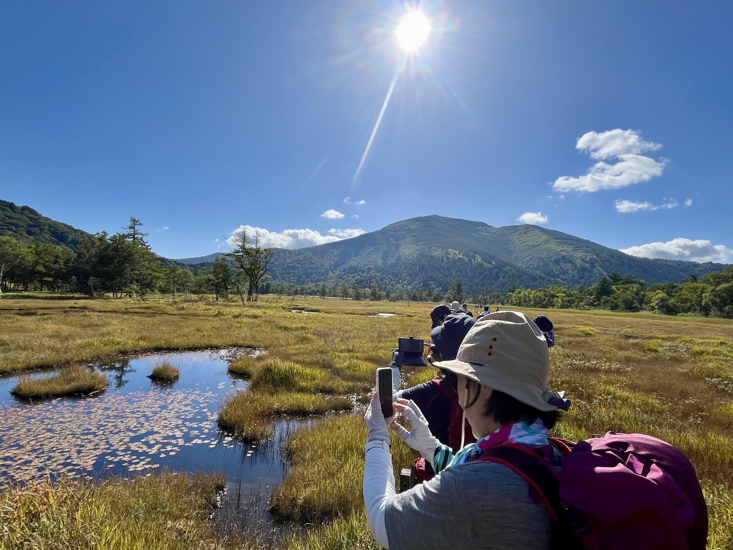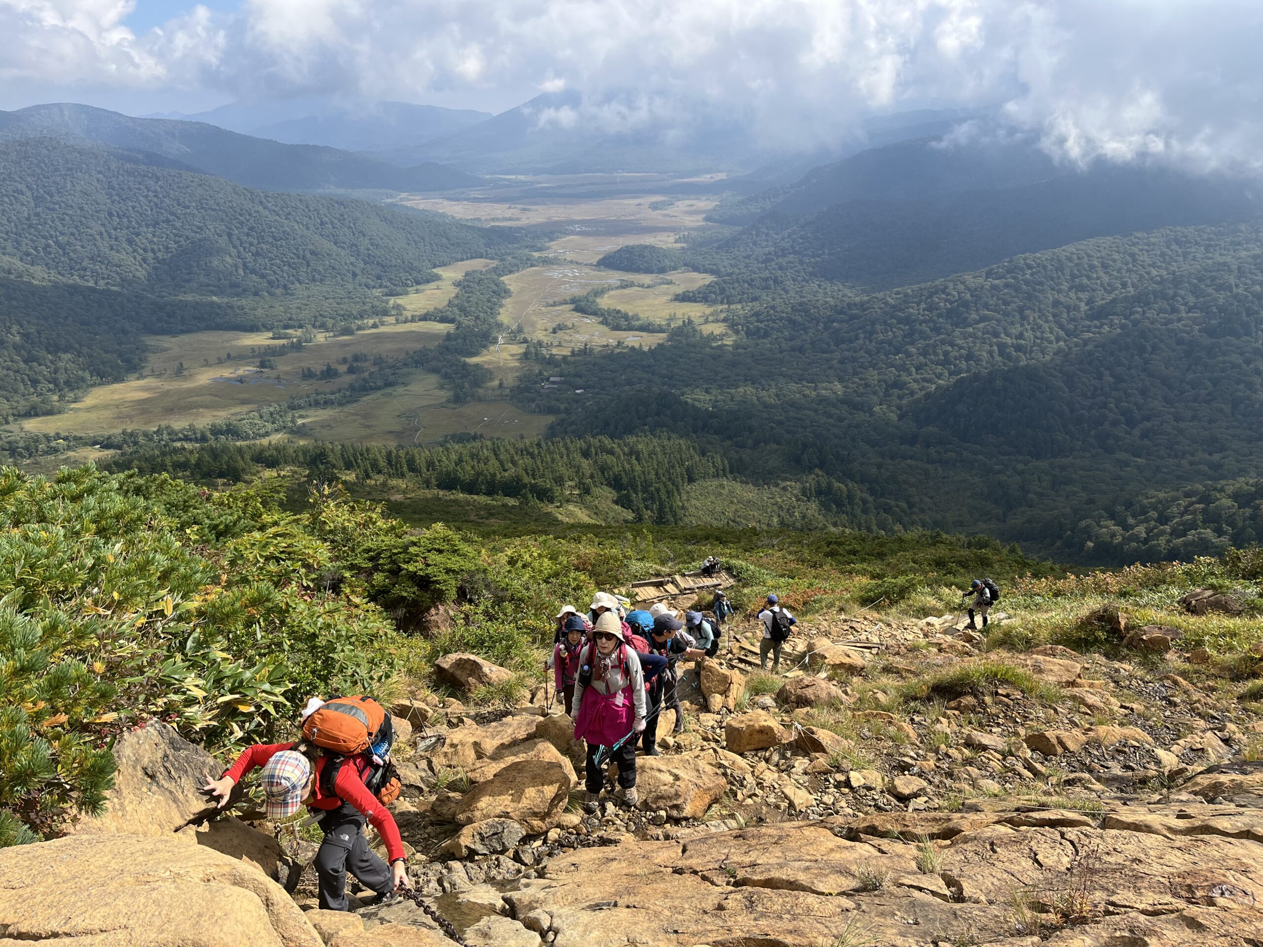 1時間超歩いたところで展望が開ける。振り返ると昨日歩いた尾瀬ヶ原が一望できて、参加者からは歓声があがる。