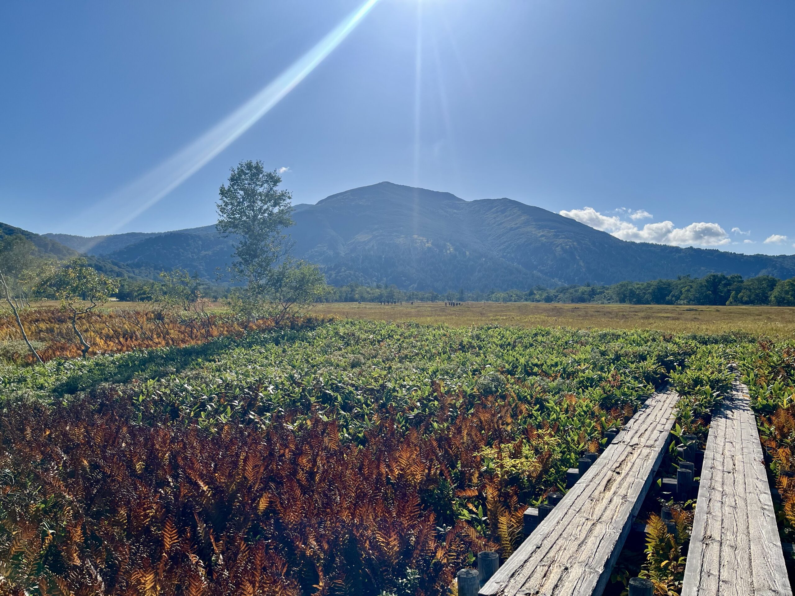 30名超えの大所帯のため、3つに隊を分けて出発。約1時間で山の鼻に到着する。本日は尾瀬ヶ原の散策のみで、牛首に向けてのんびり散策。正面には燧ケ岳、振り向けば至仏山、天気は快晴、気温もハイクには丁度良く写真を撮りながら尾瀬を満喫しました。