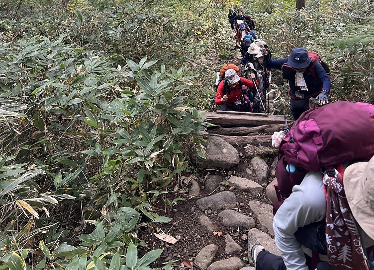 最初の1時間程度は展望も無く、休憩適地も無い登山道が続く。一方通行なのですれ違いが無いのが救いだが、一般登山者が近づいてきた際には道を譲るのが団体登山のマナー。おかげでペースは上がらないものの、参加者の一部からは「追い越しがあると休めていい」という前向きな意見も。